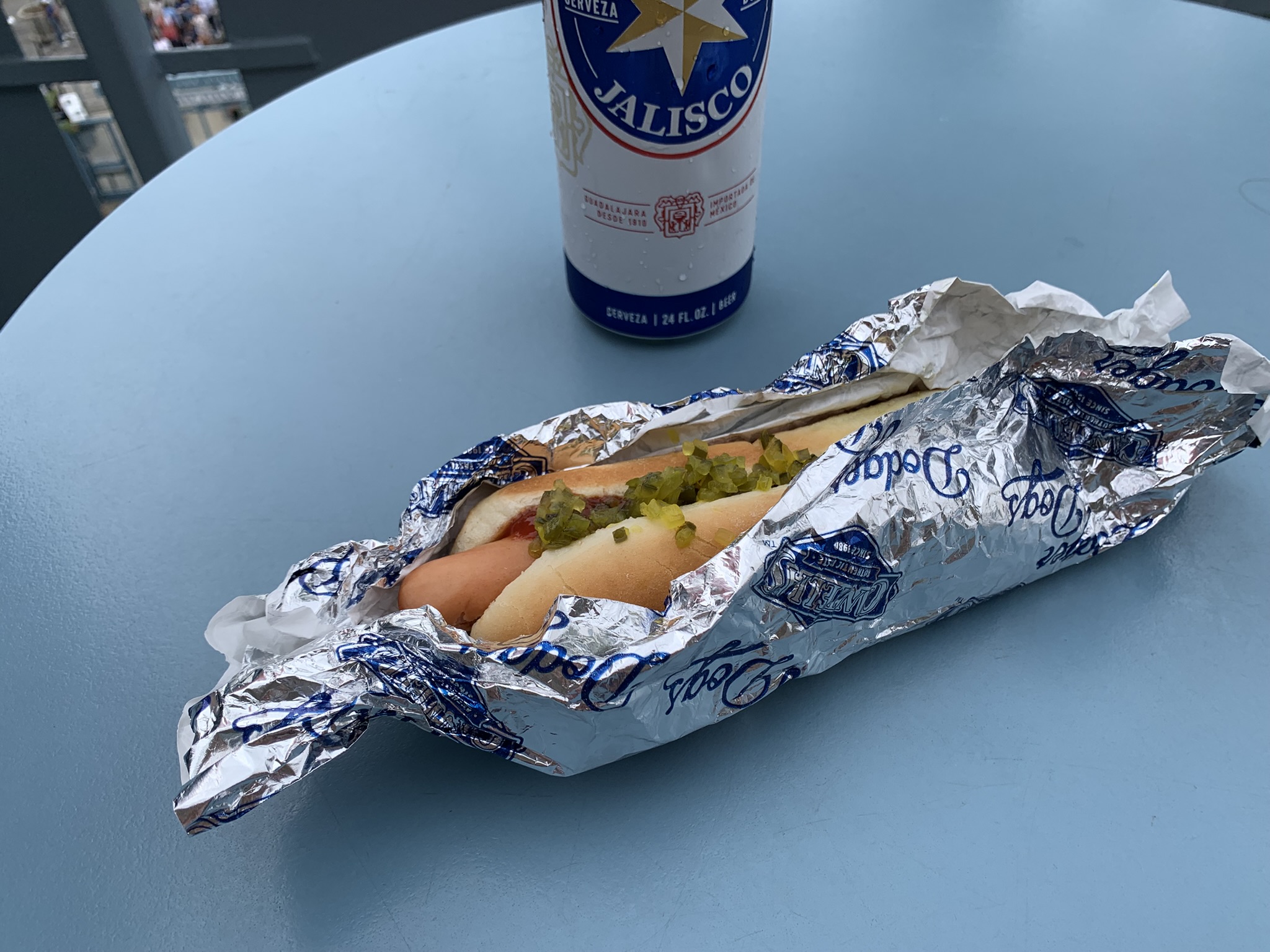 グッズショップ以外にも、フードやアルコールもたくさんあります。今回はこちらをチョイス。なんと今年から発売された新商品なんだとか。「ザ・スラッガー」というこのホットドッグは、40cmくらいのサイズ感もインパクトが強いですが、ソーセージがハラペーニョ入りで激辛!チーズソースと砕いたトルティーヤチップス、ビーンズがトッピングされています。値段は40$。シェアがおすすめ。