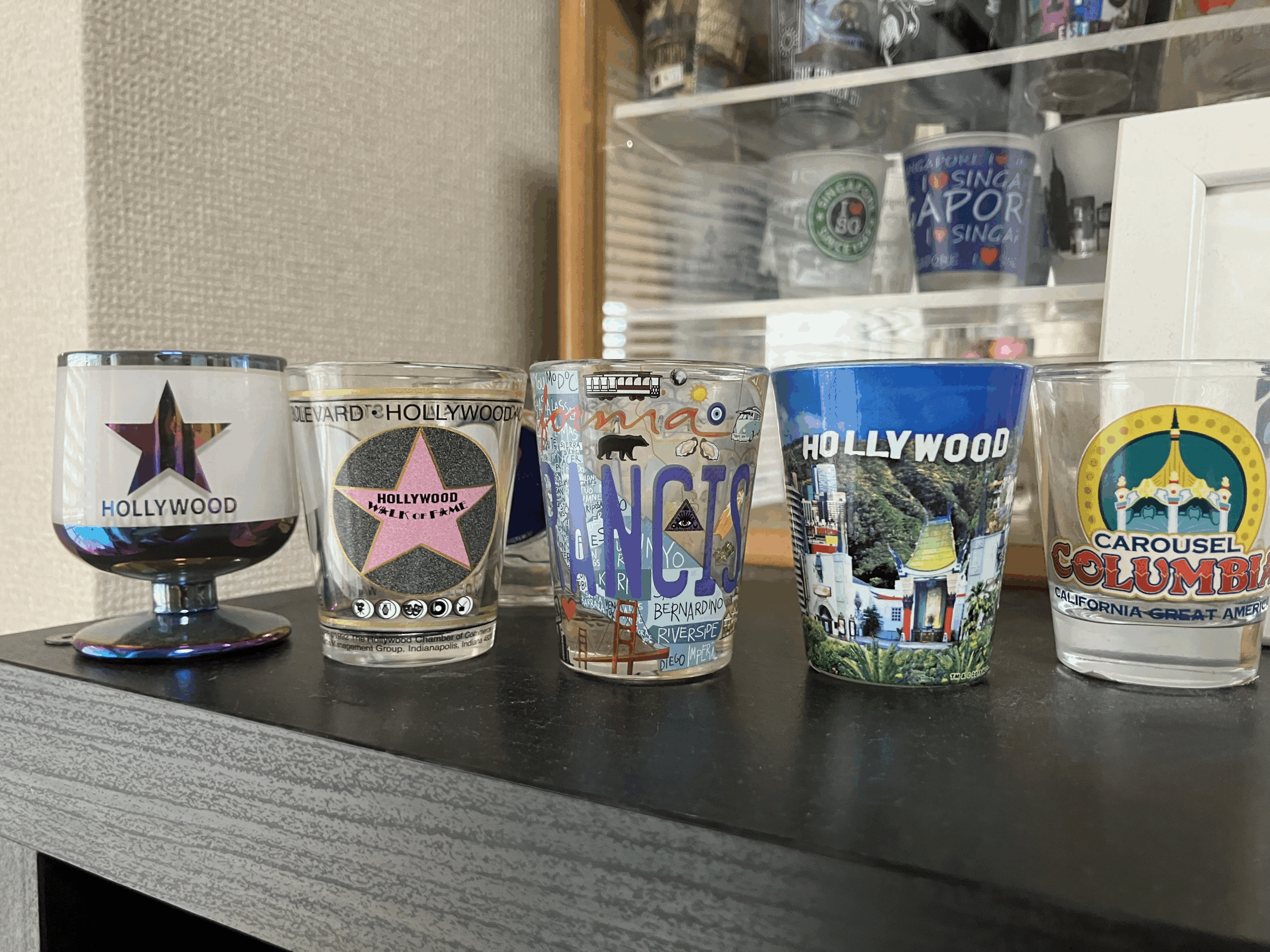 ハリウッドではいかにもというアメリカ土産を買うことができるので、旅の記念におすすめです。私はショットグラスを買うのが趣味の一つなので、こんな感じでちょっとずつ集めています。