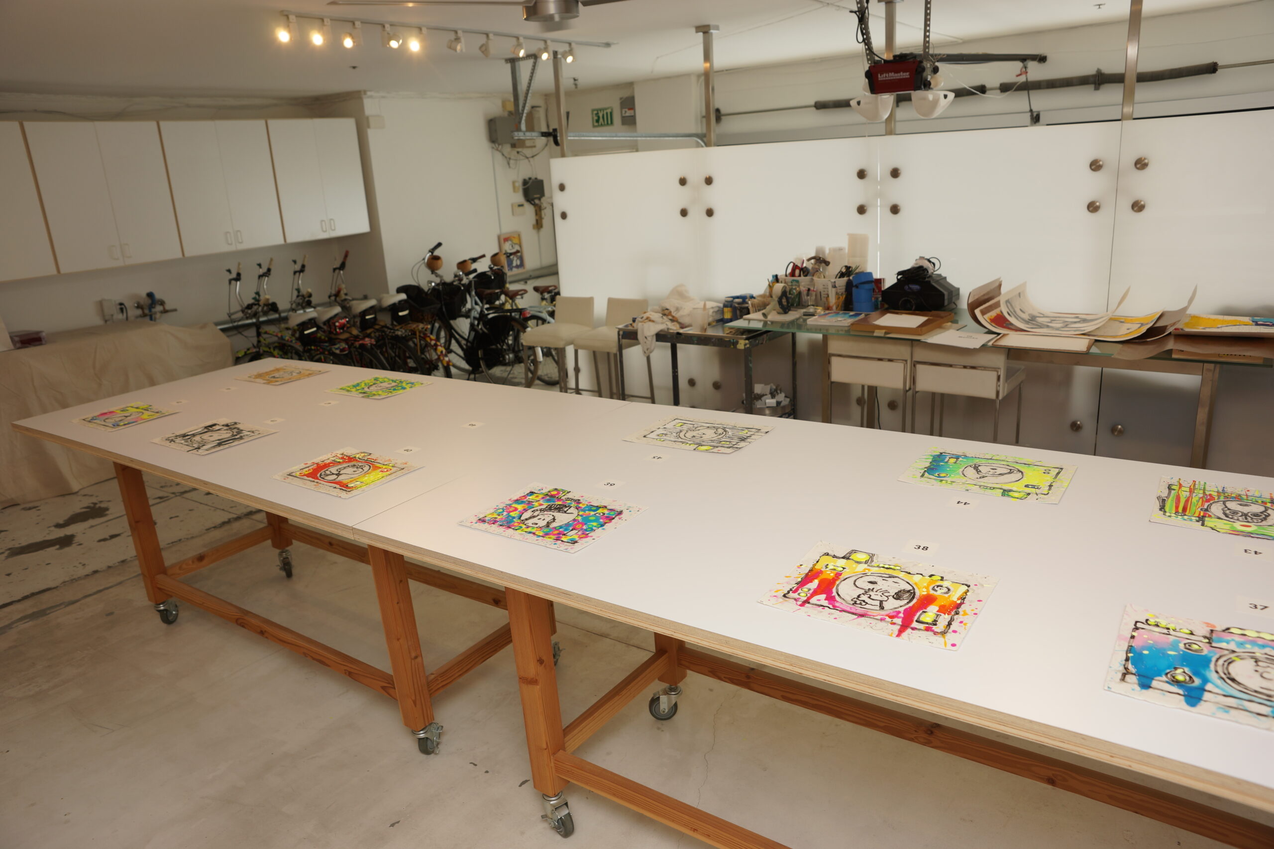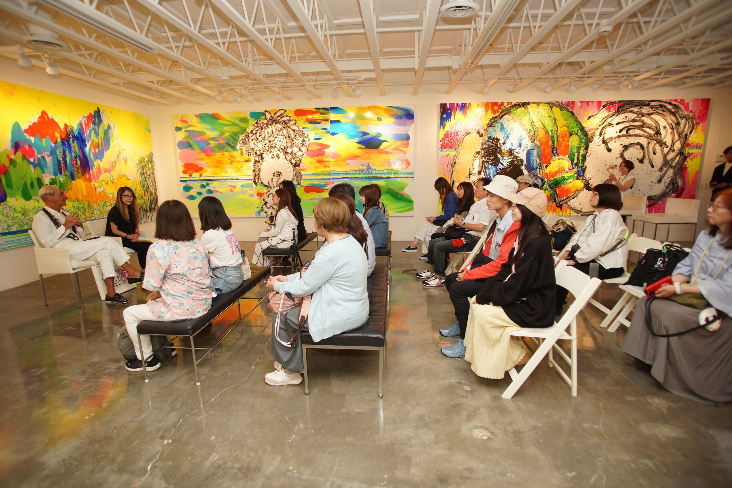 アトリエに着いてすぐ、トムさんが新しい作品についてのレクチャーをしてくれます。なかなか直接お話を伺う機会がないので、とても貴重な体験です。レクチャーの後は、お1組ずつトムさんとグリーティングの時間があるので、質問をしたり、サインをもらったりetc.