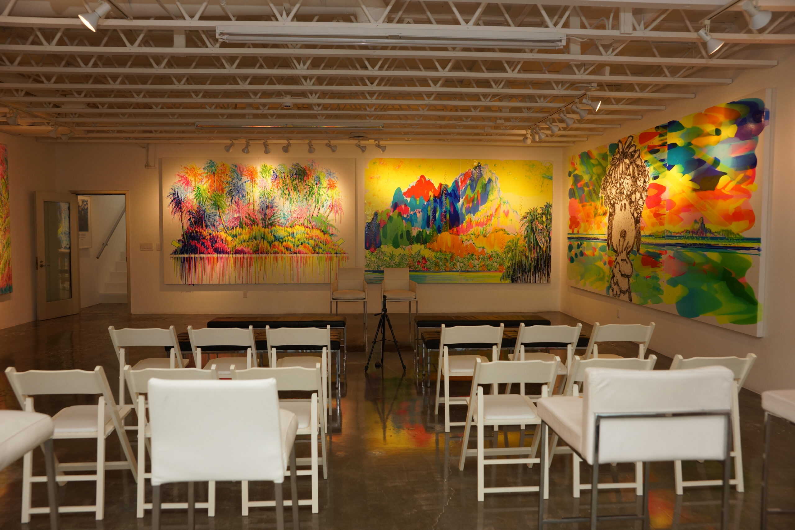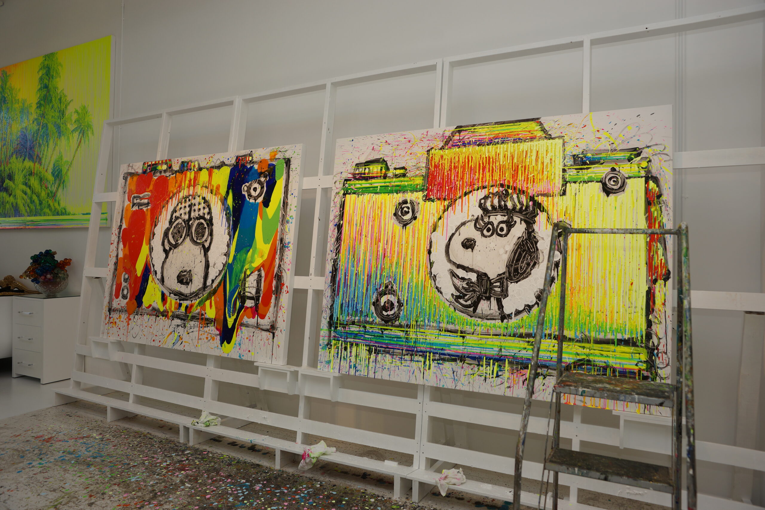 私たちが「壁画」と呼んでいる作品は、こちらに架けられているような作品のこと。版画化された「Sha La La」の原画が、右の壁に見えますね。正面にあるのは、2022年ごろからトムさんが手がけた「Hide and Seek」(日本語だと「かくれんぼ」です)のシリーズ。スヌーピーやキャラクターは描かれていませんが、ヤシの木が生い茂る島の中に隠れているのだと言います。トムさんが一番最初に手がけた「不在の中の存在」シリーズに通じるものがありますね。