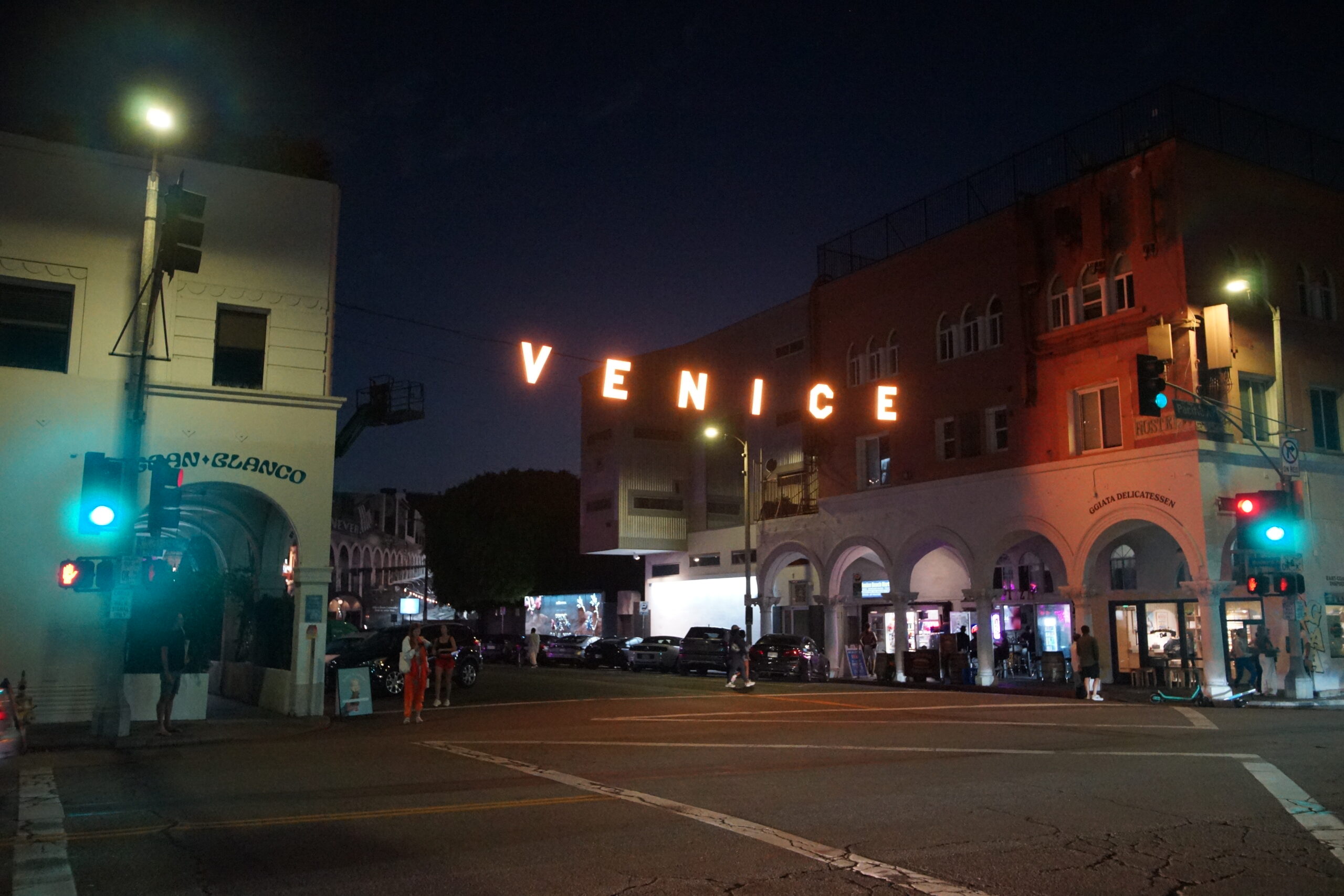 最後に、トムさんとのお夕食の様子です。みなさんとお夕飯を食べた後は、有名なベニスサインのところで記念撮影をしました。トムさんの奥さん、ジェニファーさんお気に入りの撮影スポットとのことで、まさかの道路の真ん中に全員集合しての撮影。もちろん横断歩道が青のうちに大急ぎで撮影をしました(笑)